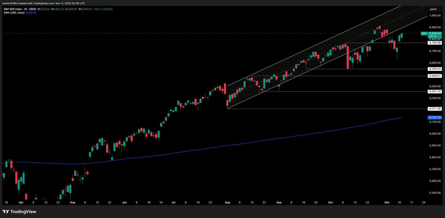 S&P 500 Update 12 November 2025ConsolidationIan ReynoldsNov 11, 2025∙ PaidShareAll quiet and 6,770 providing local support with trend channel resistance at 6,890This post is for paid subscribersSubscribeAlready a paid subscriber? Sign inPreviousNext
