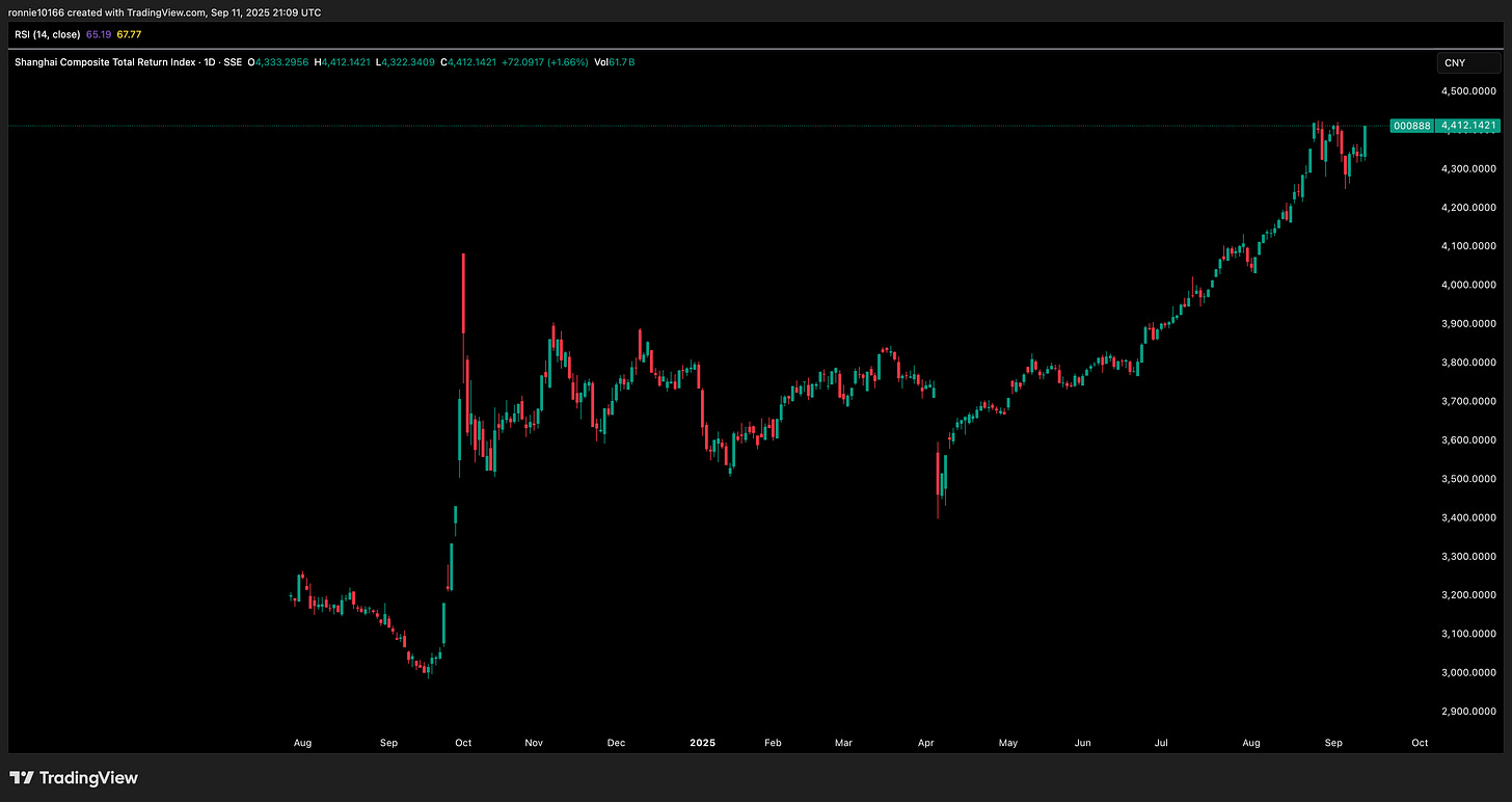 Shanghai Composite UpdateFinally a pauseIan ReynoldsSep 11, 2025ShareMaybe a pause in the amazing Chinese equity rally. Don’t bet on it as flows leaving the US accelerate. PreviousNext