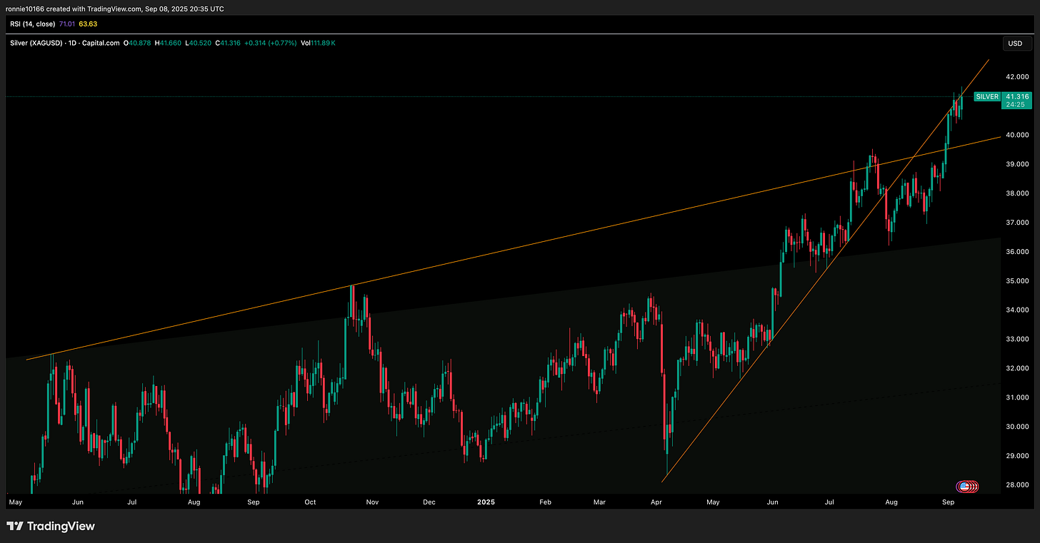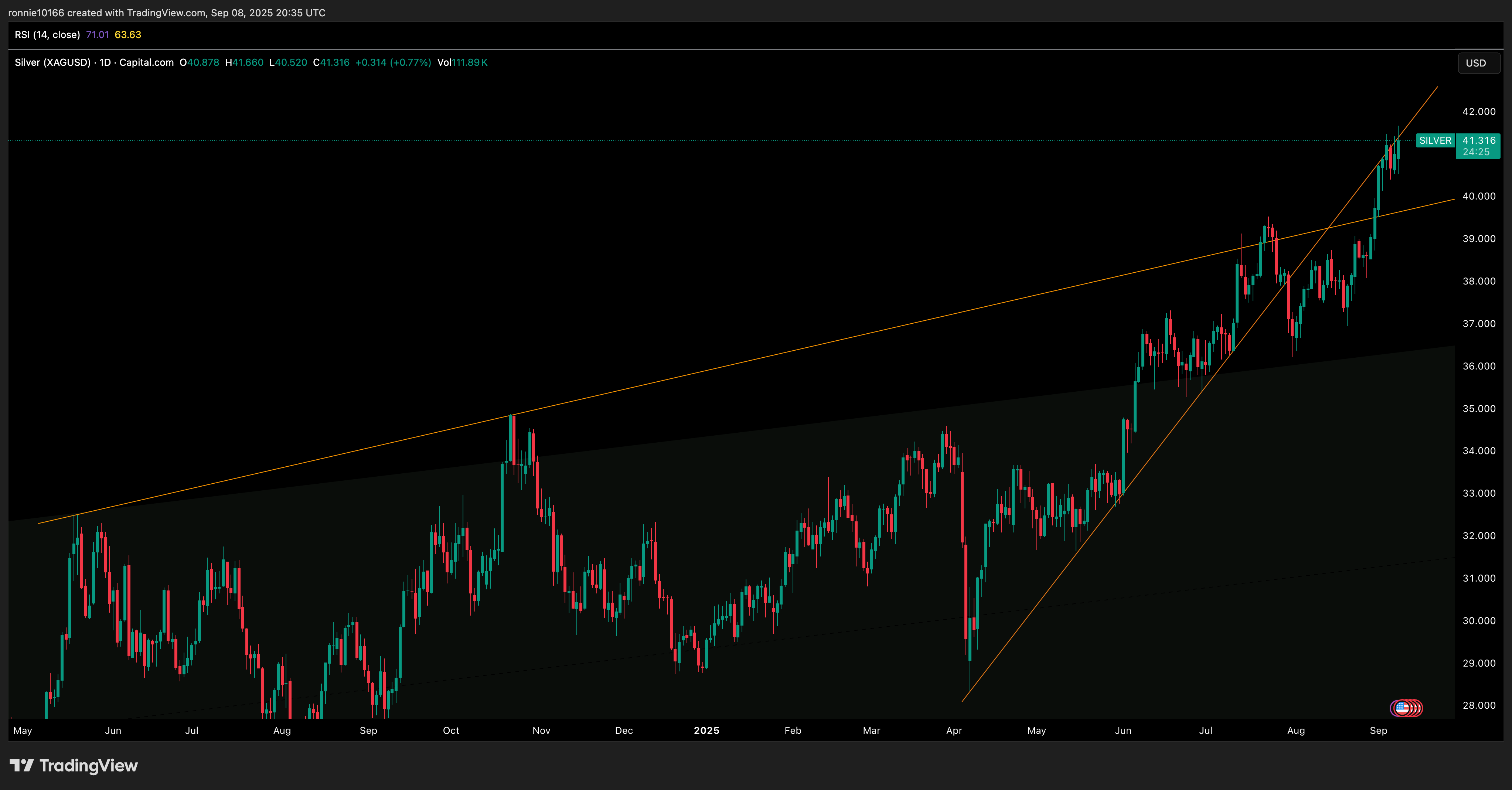 Silver UpdateSilver not quite there yetIan ReynoldsSep 08, 2025ShareNice close for Silver but we’re still not over the pivot line. A big cut by the FED next week could damage price as economy is perceived to be tanking, Silver being both an industrial metal and a precious metal.Support39.70Resistance41.50PreviousNext