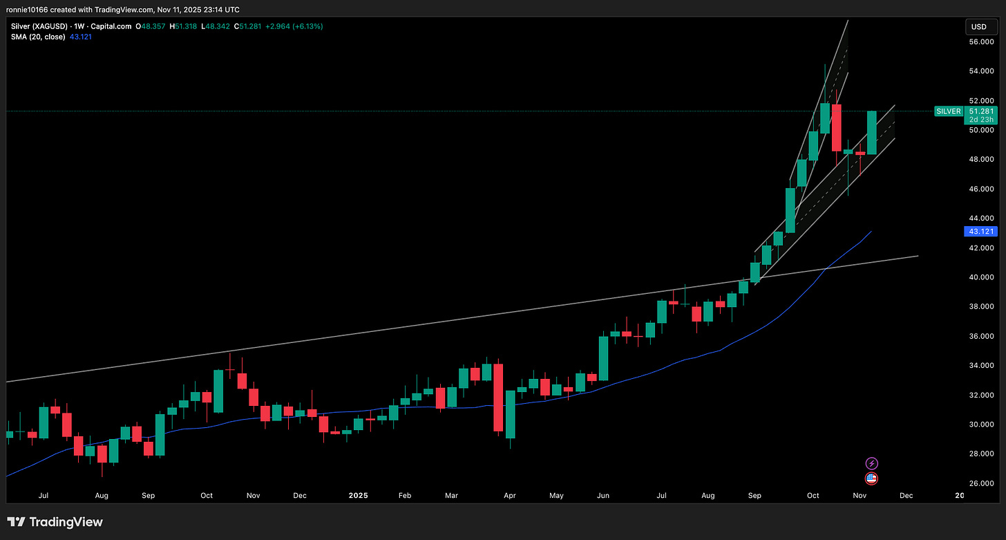 Silver Update 12 November 2025Looking strongIan ReynoldsNov 11, 2025ShareGood performance from Silver yesterday as economic uncertainties rise. Into trend resistance at 51.50. We’re looking at 52.30 as the acceleration point higher. Looking at the weekly it’s a really strong rebound. PreviousNext