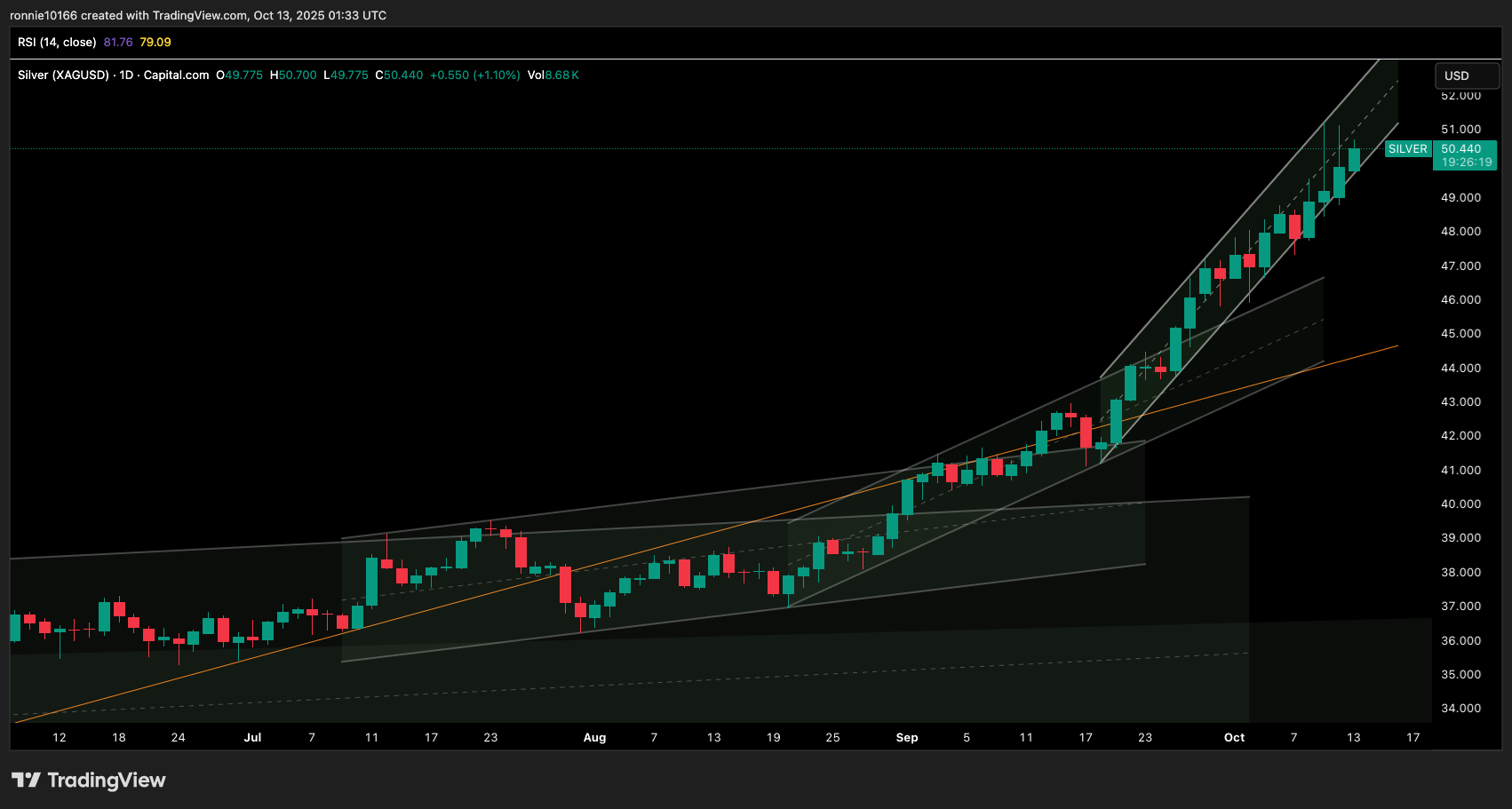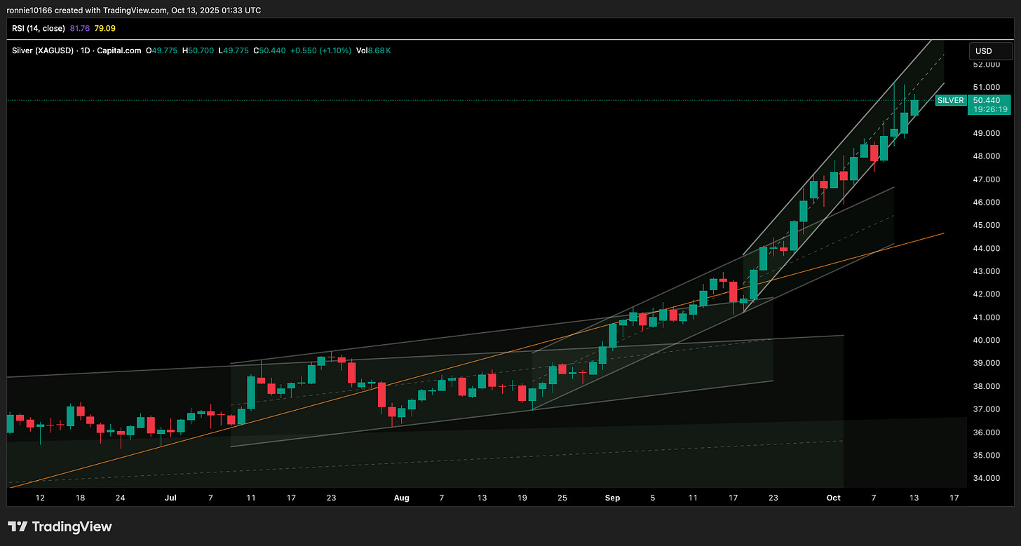 Silver Update 13 October 2025$50+Ian ReynoldsOct 13, 2025∙ PaidSharePrice trading quietly on $50 this morning as if nothing happens in Comex/LBMA time.This post is for paid subscribersSubscribeAlready a paid subscriber? Sign inPreviousNext