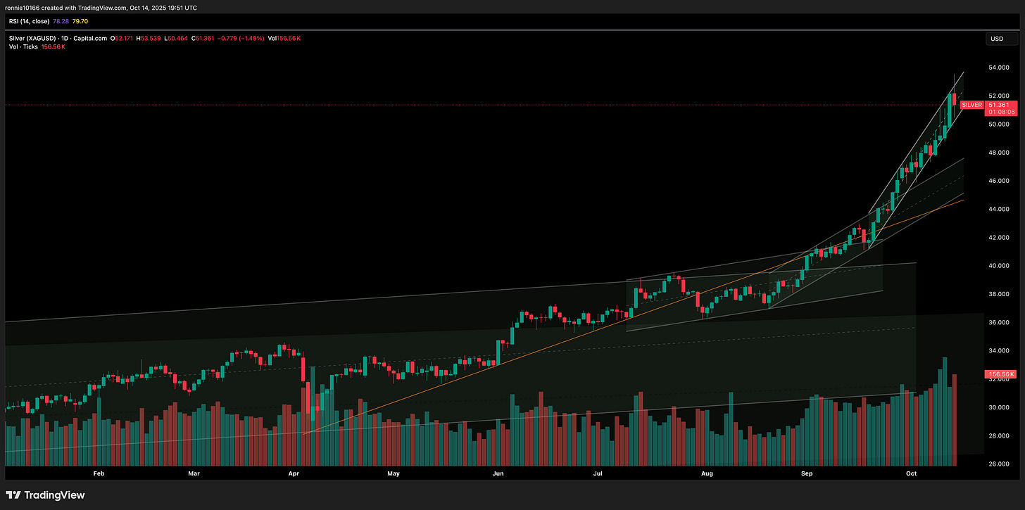 Silver Update 15 October 2025Dramatic price rangeIan ReynoldsOct 14, 2025∙ PaidShare6% price movement yesterday as the relentless buying met sellers big time at $53.50. For sure the selling was big and consistent and drove price back to $50.50 before the sellers backed offThis post is for paid subscribersSubscribeAlready a paid subscriber? Sign inPreviousNext