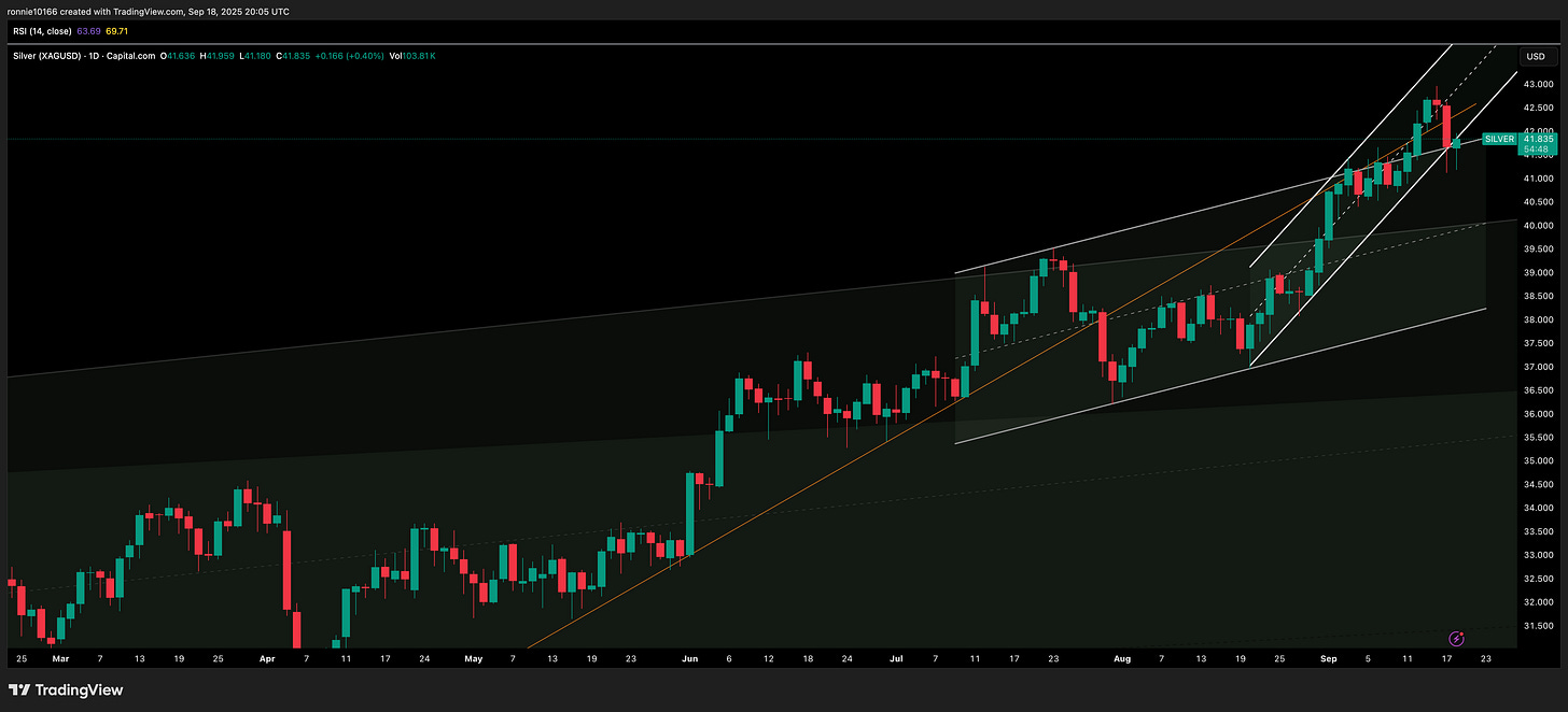 Price still hanging in there just below $42. Today’s (and this week’s close) is vital for the continued upside impetus. Whereas gold has $3,500 as a near solid support, silver’s is a lot messier and the market more skittish.