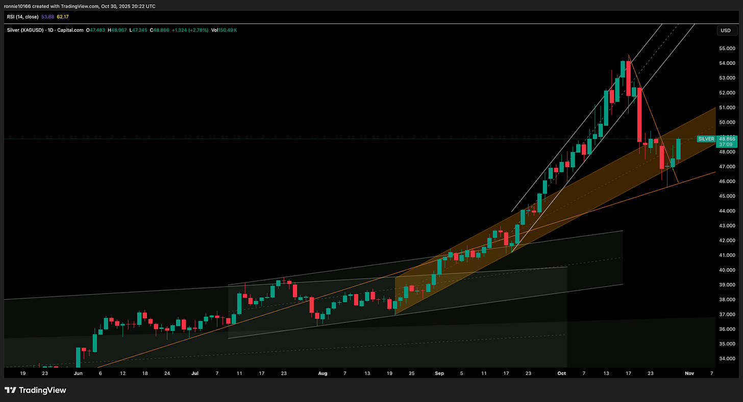 It took the tone of Powell’s address to sink in, to turn Gold and Silver bullish again. The pivot line from 6 months ago was tagged in the last few days, and the orange uptrend channel regained.