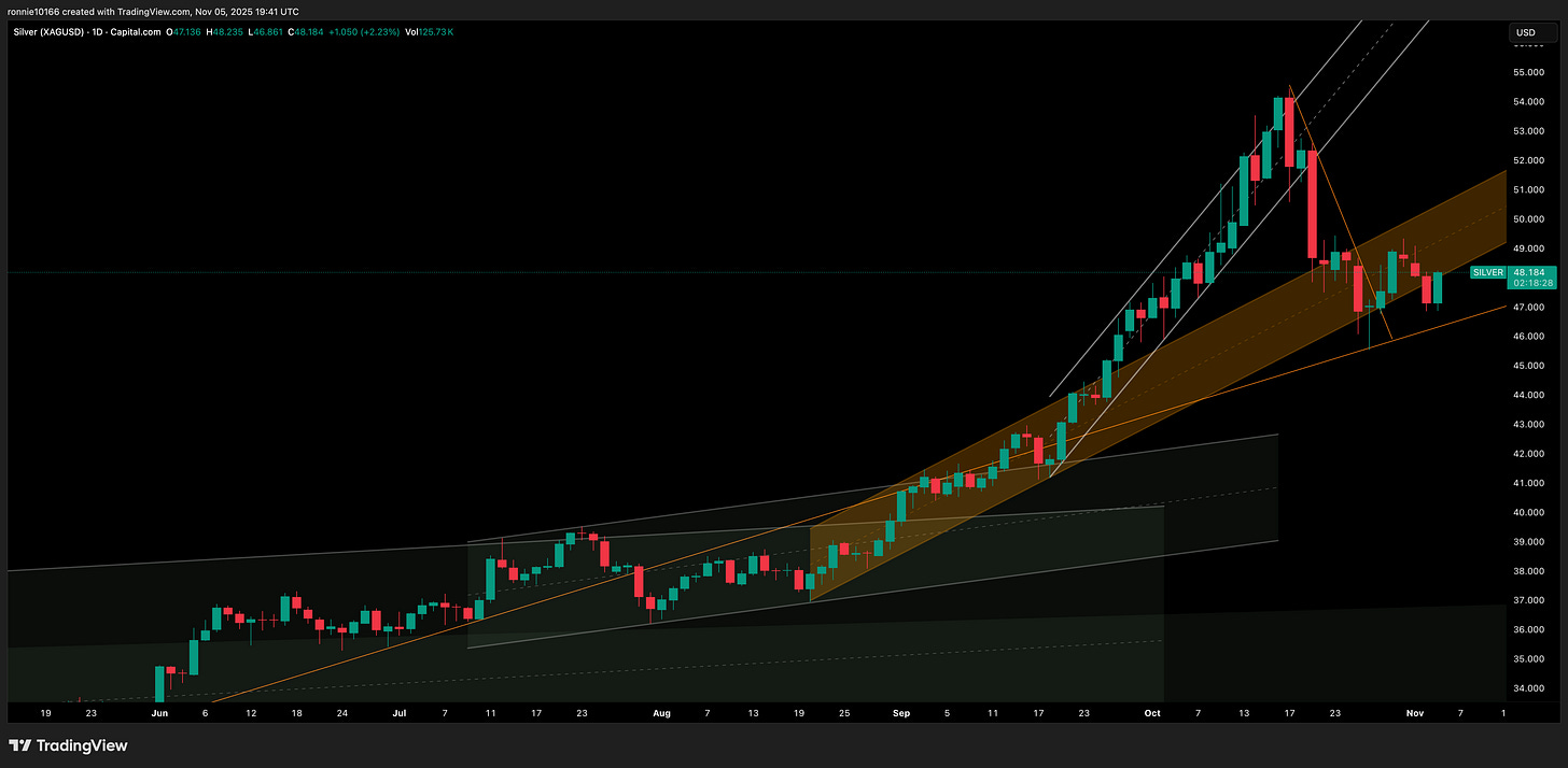 A bounce and a close back in the trend. Price needs to push higher to confirm. The spike lower to 45.50 may be the platform to start making short-term higher lows and higher highs. Getting above 49.35 is key and once 50.00 is hit again, Silver fever will start again.