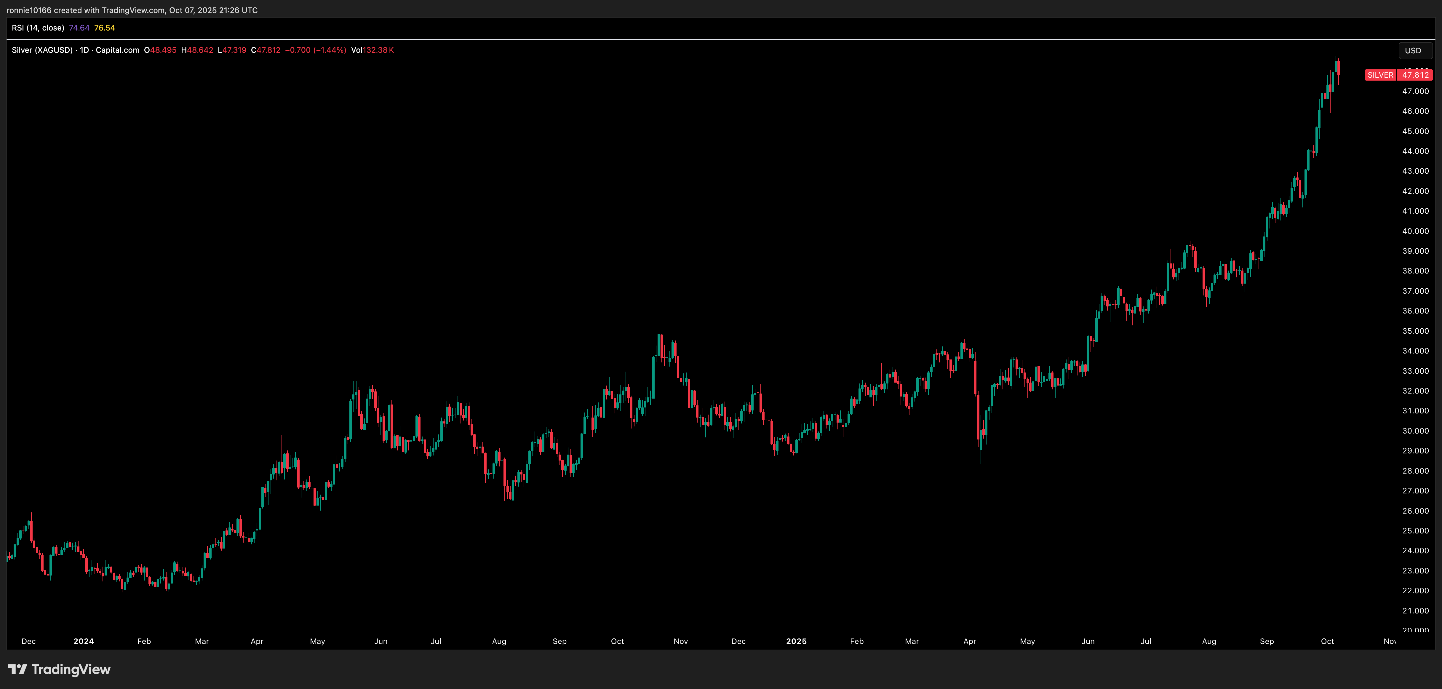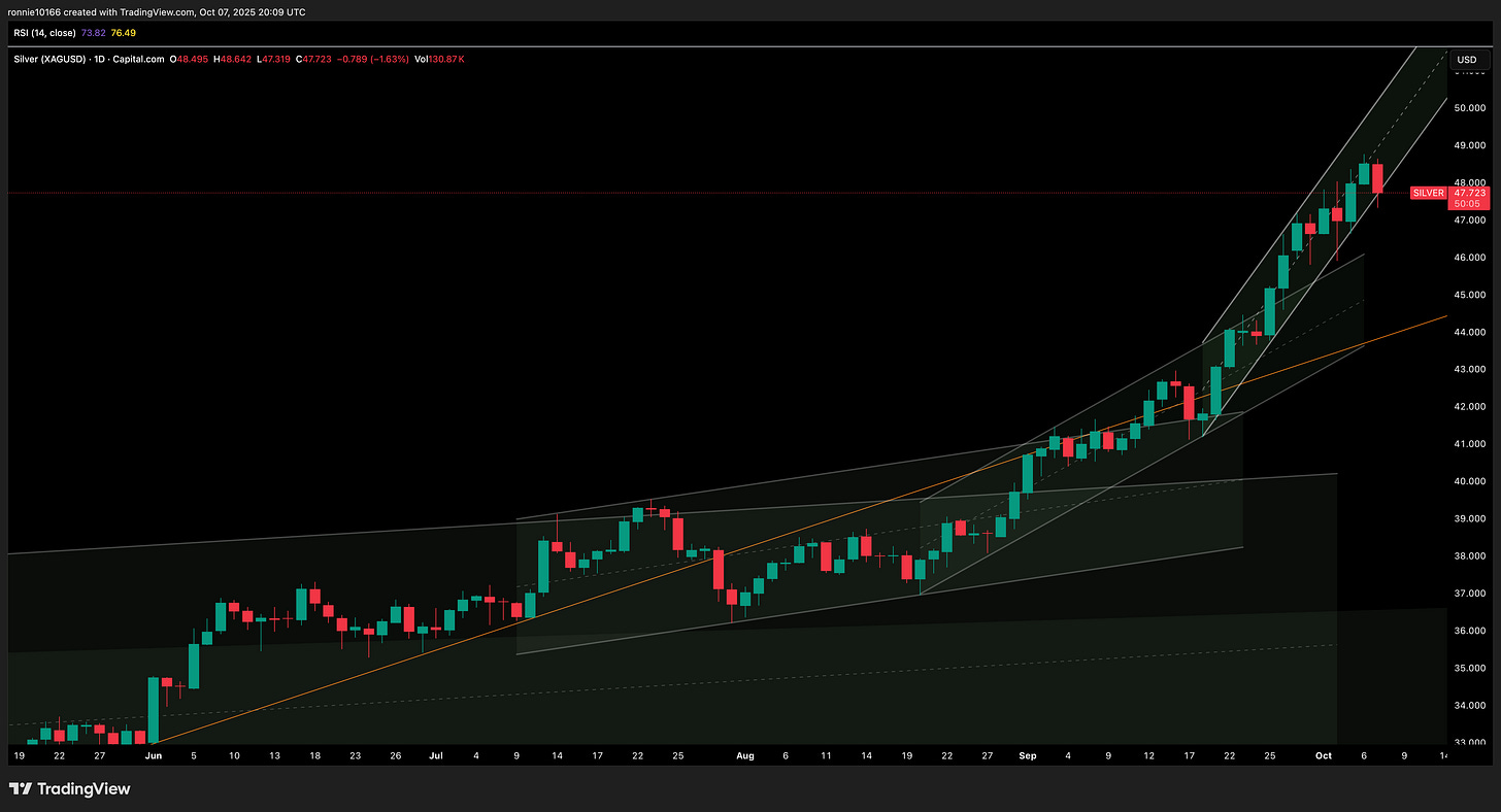 Silver Update 8 October 2025More perspective neededIan ReynoldsOct 07, 2025ShareSilver’s tight uptrend beginning to break and a trip to $46.20 could be on the cards.On a bigger washout trend and pivot support at $44.15 looks good. It’s important to see this trend in perspective. $21 to $48.PreviousNext