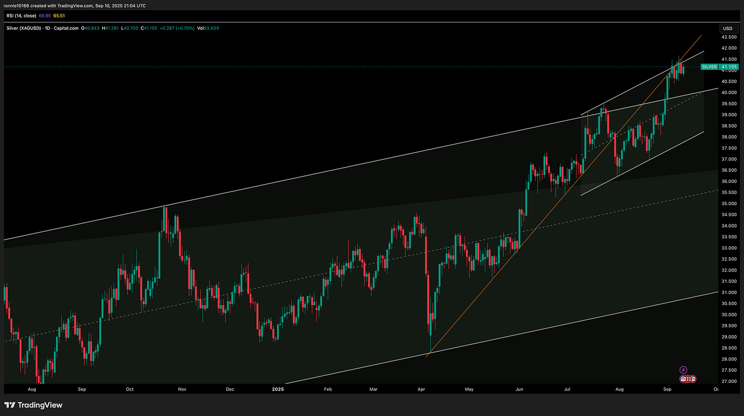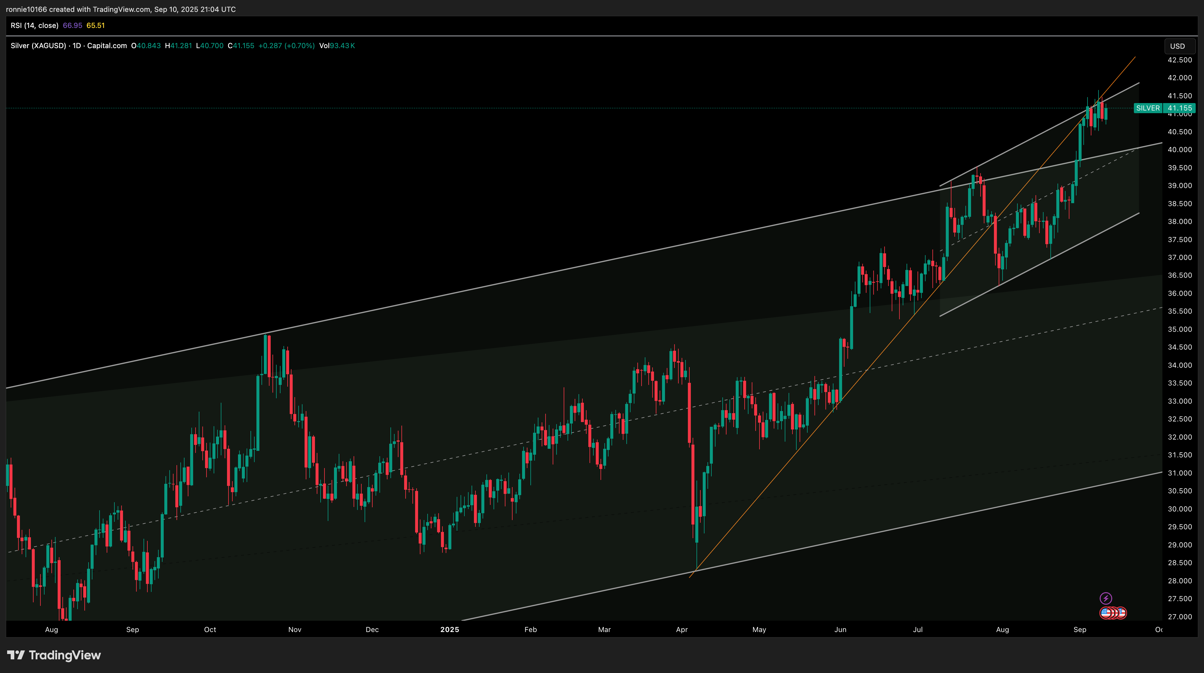 Silver UpdateBanging on the doorIan ReynoldsSep 10, 2025ShareA positive day so far for Silver but getting through the 2 resistance lines will need a lot of fuel, and with the narrative of a now weak US economy, that seems to be unlikely.Most likely a bull flag here or retrace to the sene of the crime at $39.PreviousNext