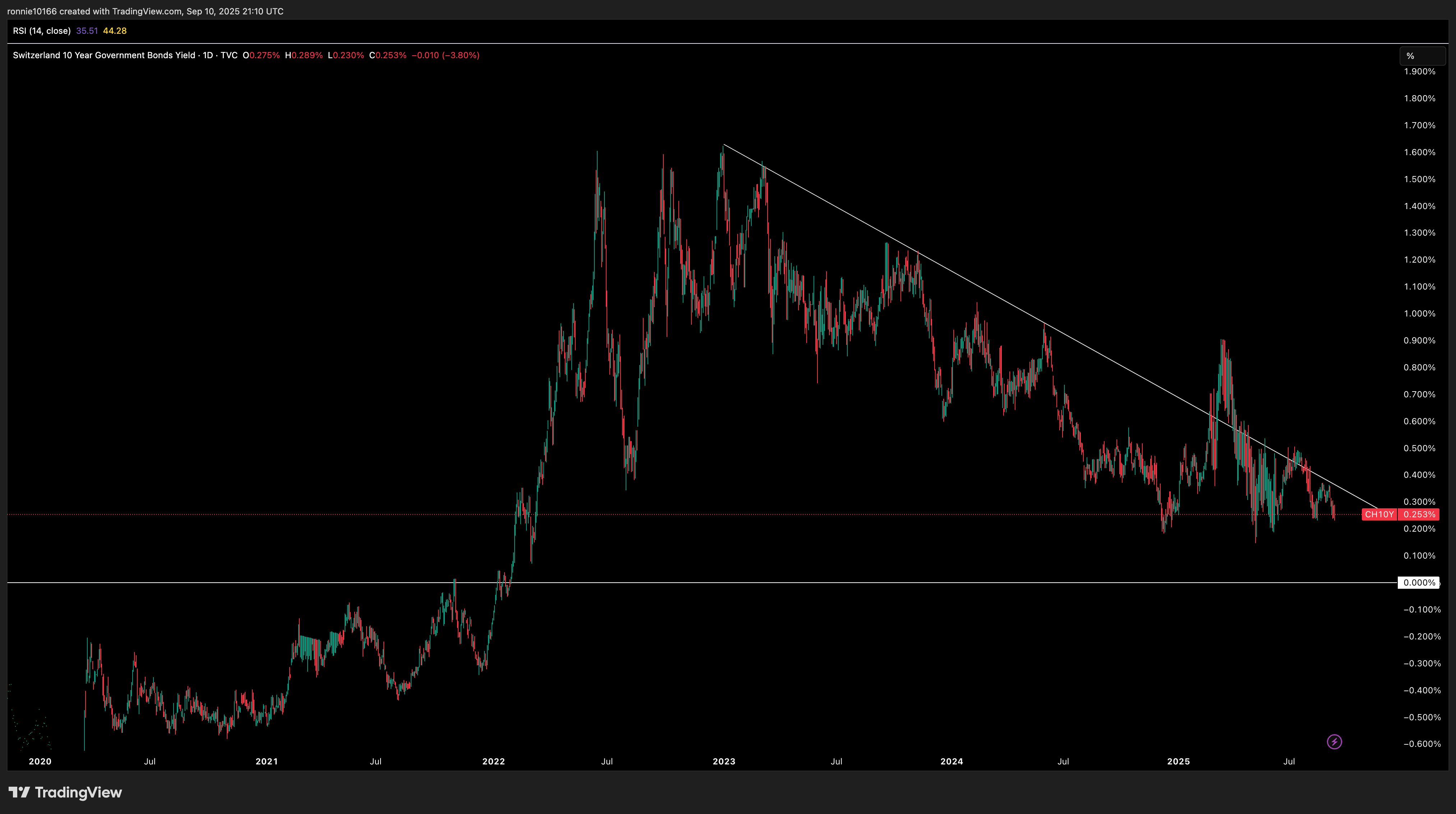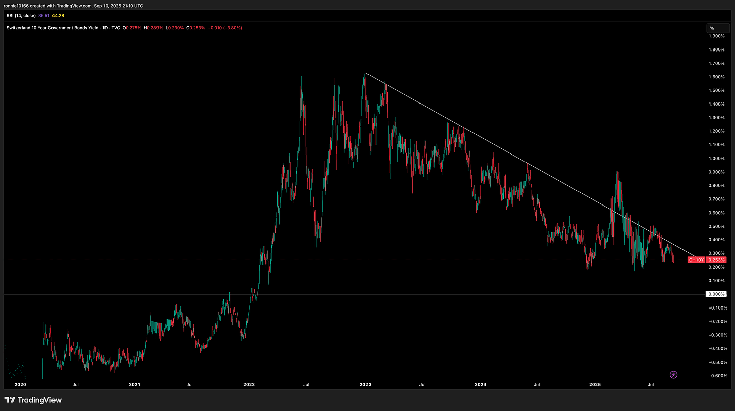 Switzerland 10 Year Government Bond UpdateThe trend is clear and scaryIan ReynoldsSep 10, 2025ShareNo technical analysis needed. Won’t be soon before Swiss yields are negative again and that means trouble.PreviousNext