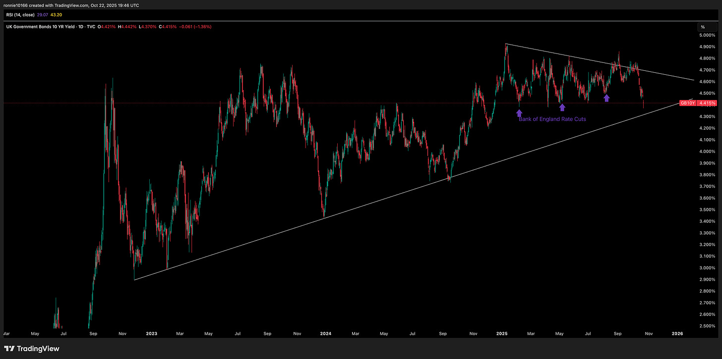UK 10 Year Yield Update 23 October 2025UK inflation dropsIan ReynoldsOct 22, 2025∙ PaidShareMuch better than expected UK CPI (remember, the Bank of England told us this would happen) prompts big rally in Gilts despite all the political and debt issues. Yield is back near to when the Old Lady first cut this year on February 6th.This post is for paid subscribersSubscribeAlready a paid subscriber? Sign inPreviousNext