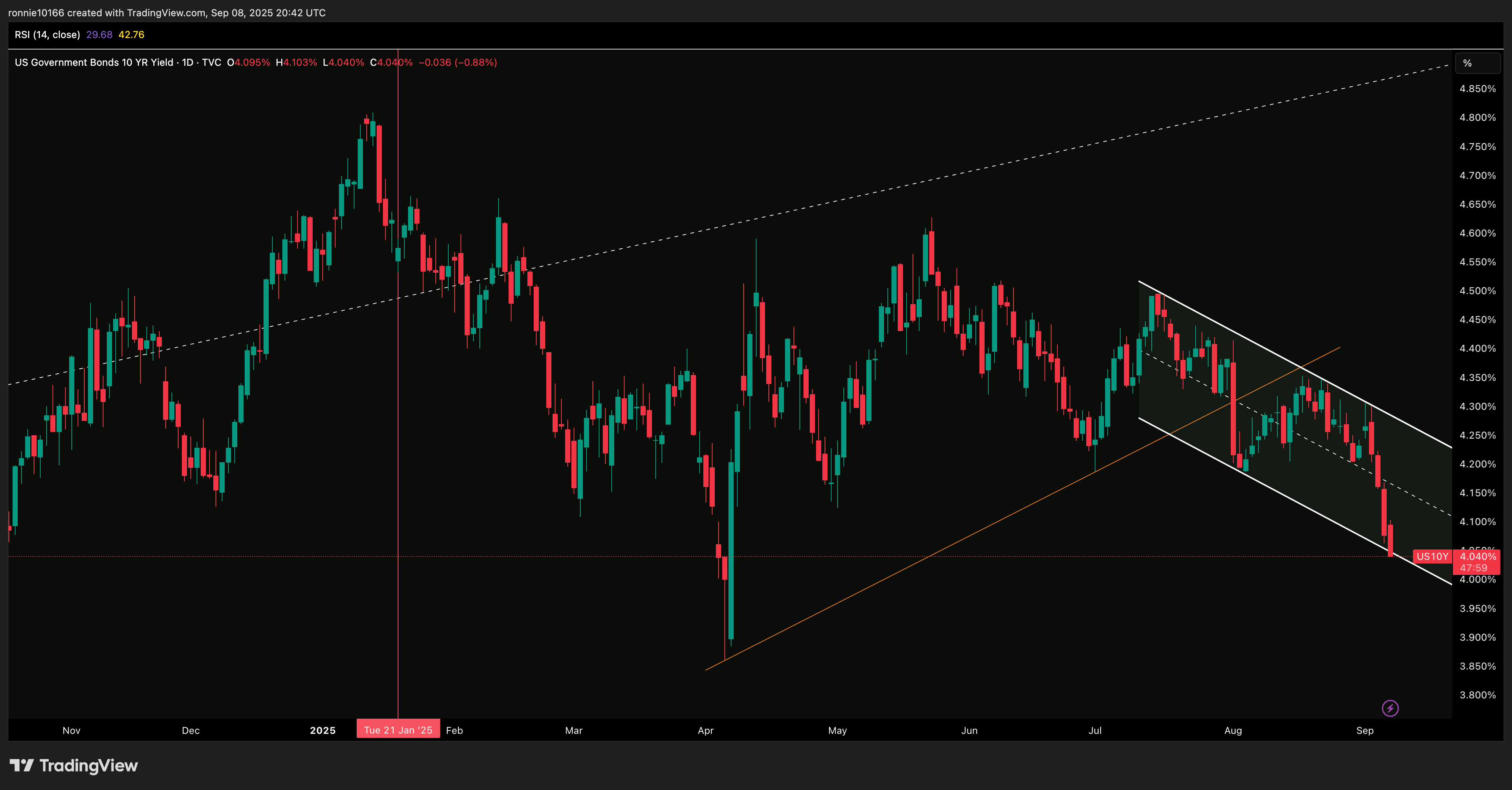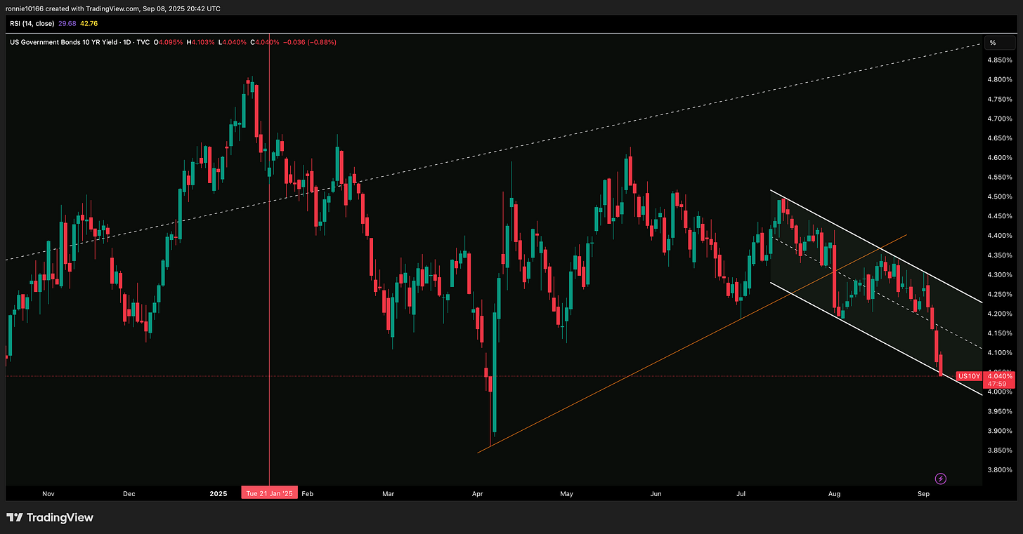 US 10 Year Yield Update4 days of yields droppingIan ReynoldsSep 08, 2025ShareWhat’s the opposite of “this train never stops”? 25bps drop in last 4 trading days as narrative turns on a dime. BLS debacle means we have no real guage of the economy. Lucky the FED is on hand.PreviousNext