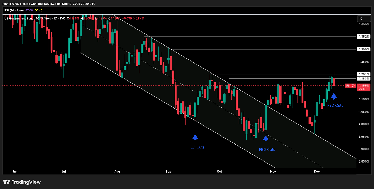 US 10 Year Yield Update 11 December 2025Will the rate cut send yields higher again?Ian ReynoldsDec 11, 2025∙ PaidShareA brief rally on the news. Since yield returned to the scene of the crime on 28 November, the only way has been up. The charts are quite clear: below 3.96% and bonds will rally hard and above 4.20% bonds will fall out of bed.This post is for paid subscribersSubscribeAlready a paid subscriber? Sign inPreviousNext