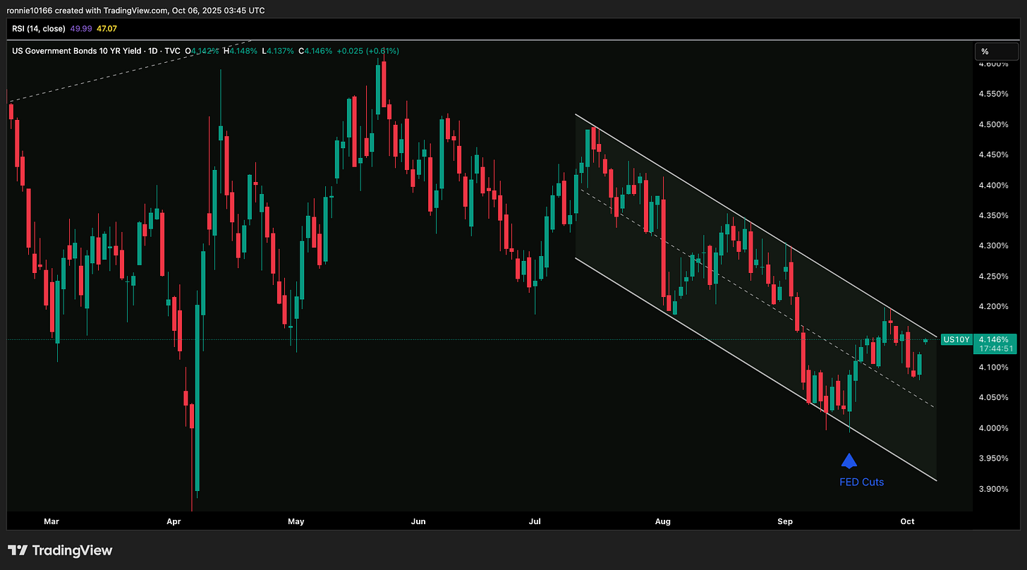 US 10 Year Yield Update 6 October 2025Sudden gap up in yieldIan ReynoldsOct 06, 2025∙ PaidShareBonds and USD were skittishly higher in early Monday trading amidst fake Nonfarm Payroll numbers and the surprise election result in Japan.This post is for paid subscribersSubscribeAlready a paid subscriber? Sign inPreviousNext