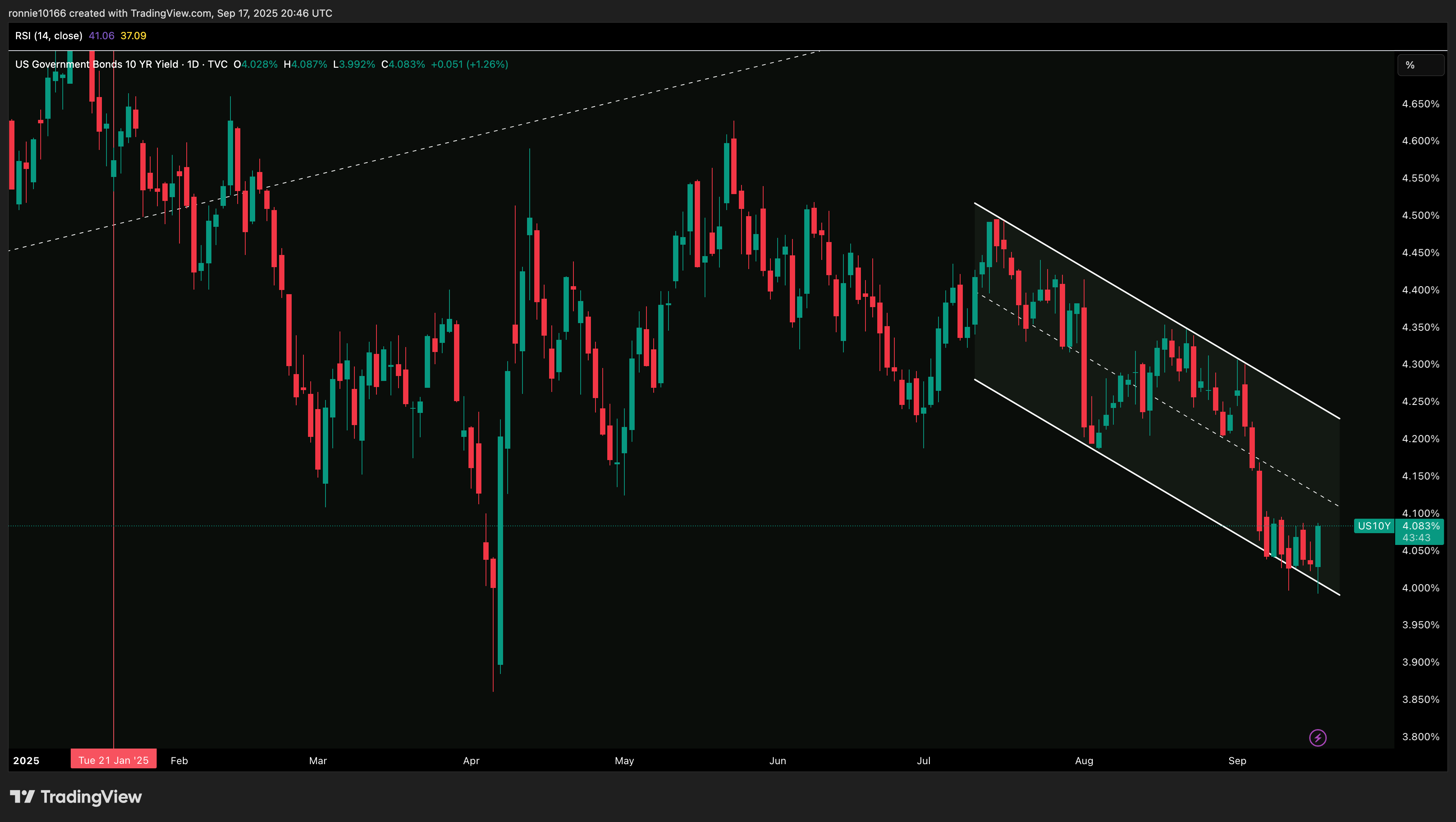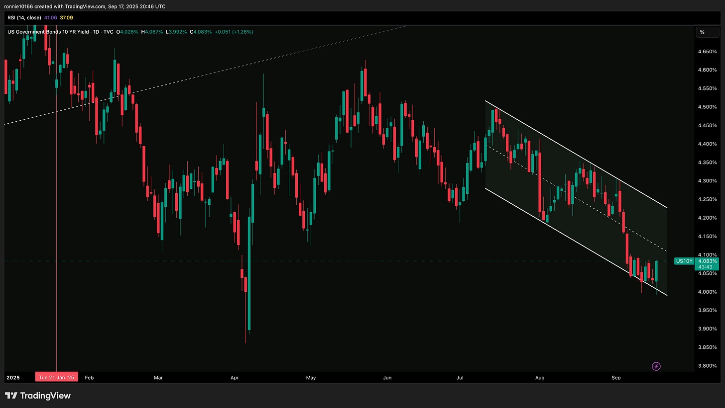 FED cuts and rates go up. That’s the story of this year. Maybe some disappointment that only 25bps. Anyway the charts don’t care: double bottom at 4% with no close below 4.02% and we consolidate into a bear flag or the trend channel pushes us back to 4.25%.