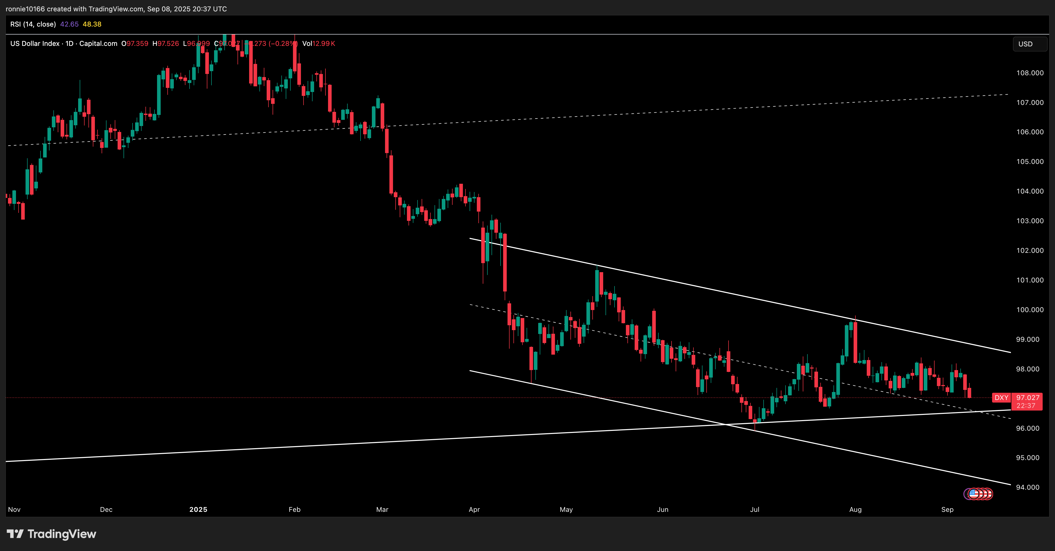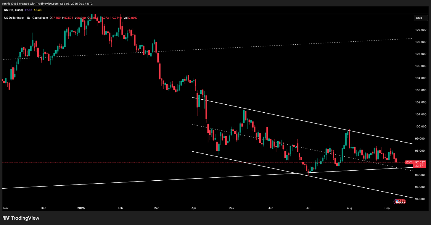 USD UpdatePrice looking ominousIan ReynoldsSep 08, 2025ShareLooks like a second recent stab at 15 year support. Price just can’t catch any sort of bid. Only Powell can save the dollar by sacrificing the economy.Support96.65Resistance97.85PreviousNext