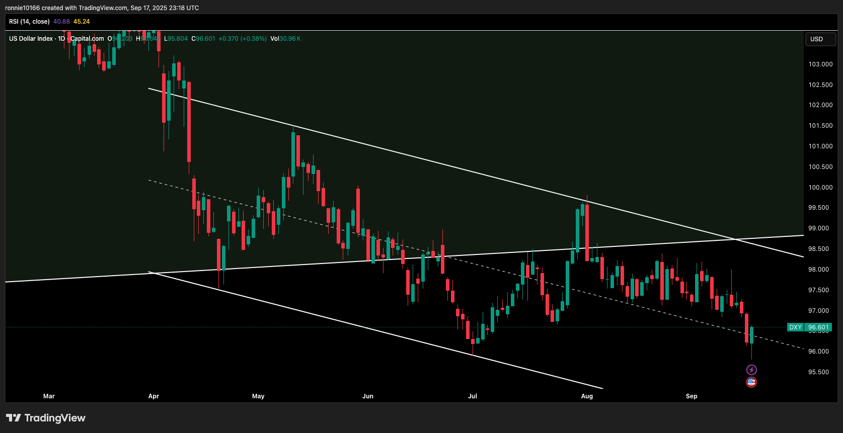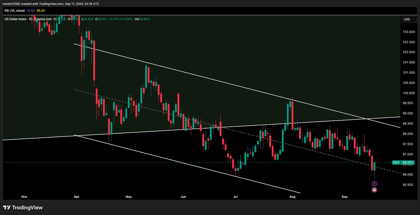 USD, via DXY, spikes despite the initial sell-off from the rate cut. We’re currently at the pivot point resistance at 96.75. which is key to maintaining the downward momentum. We’re still looking for 94.00 short-term. Only above 98.80 is bear view wrong.