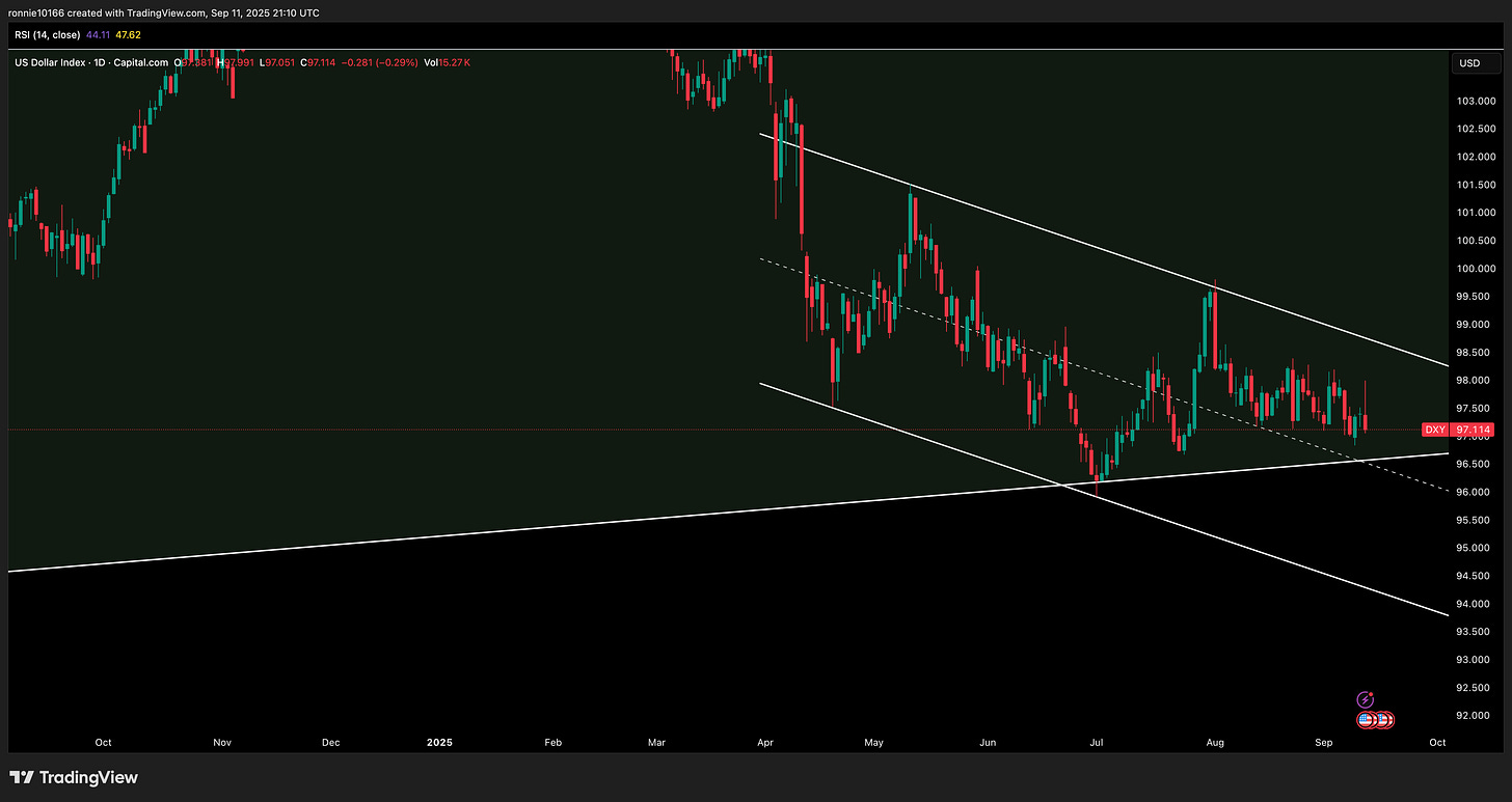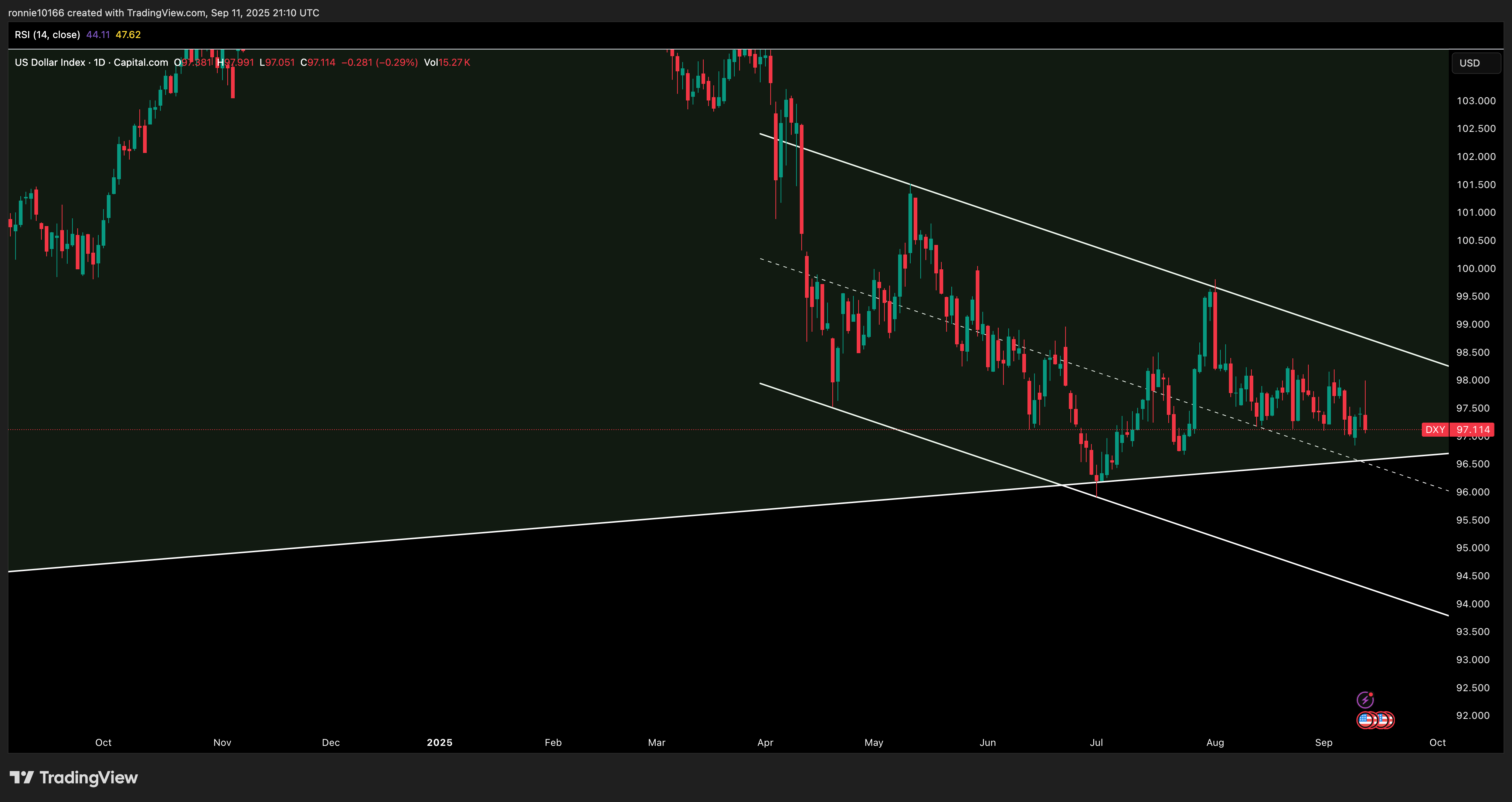 USD UpdateDXY teeteringIan ReynoldsSep 11, 2025ShareDXY can’t sustain any sort of rally, and the grim reaper beckons. 15 year uptrend could get broken on Wednesday. Or notPreviousNext