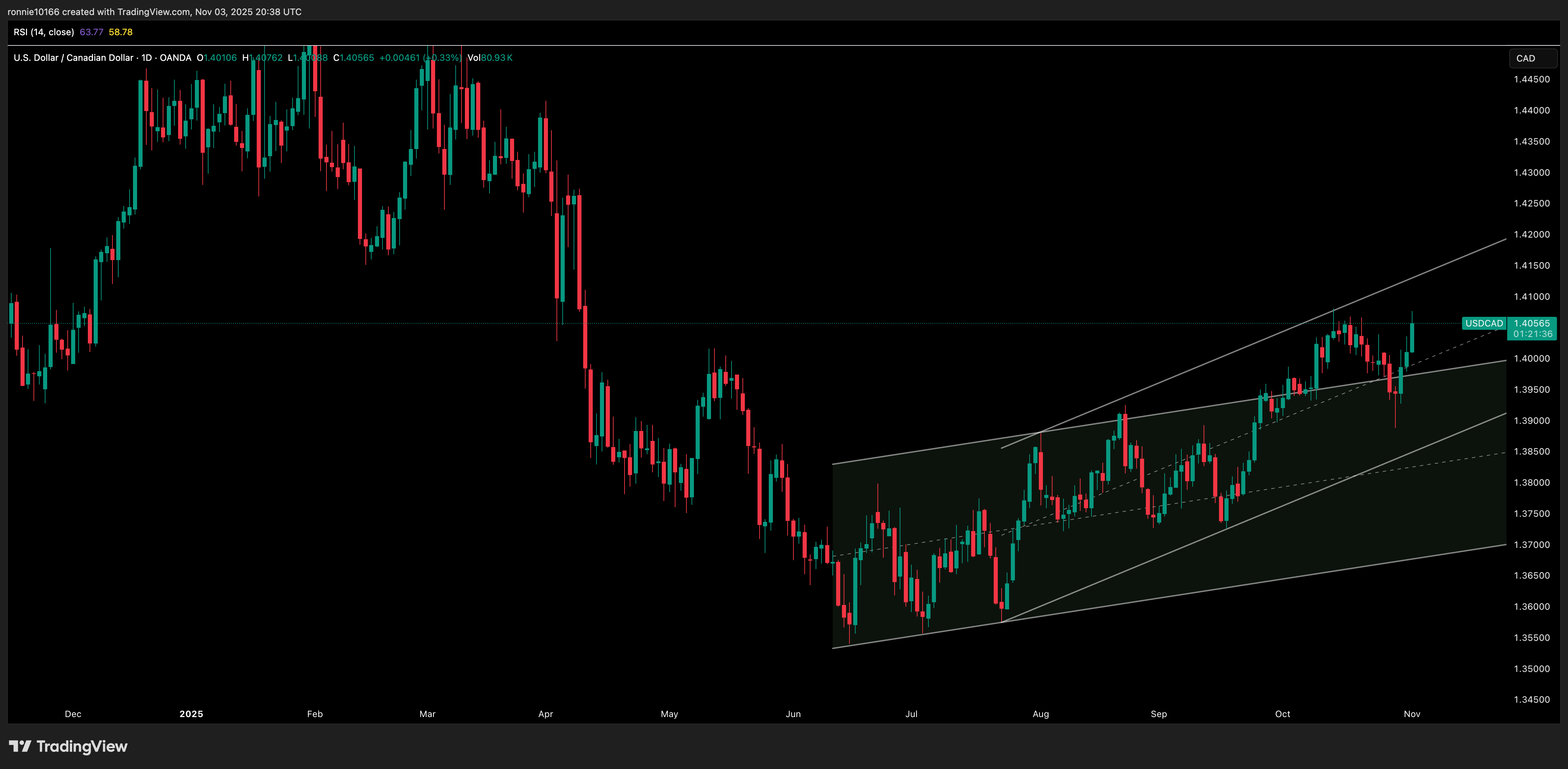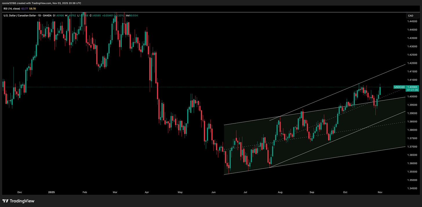 USD/CAD Update 4 November 2025Following USD/YEN higherIan ReynoldsNov 03, 2025∙ PaidShareThe spike lower around 1.3900 on 29 October looks to have found the floor to push higher from. Above the 1.4075 pivot looks very bullish.This post is for paid subscribersSubscribeAlready a paid subscriber? Sign inPreviousNext
