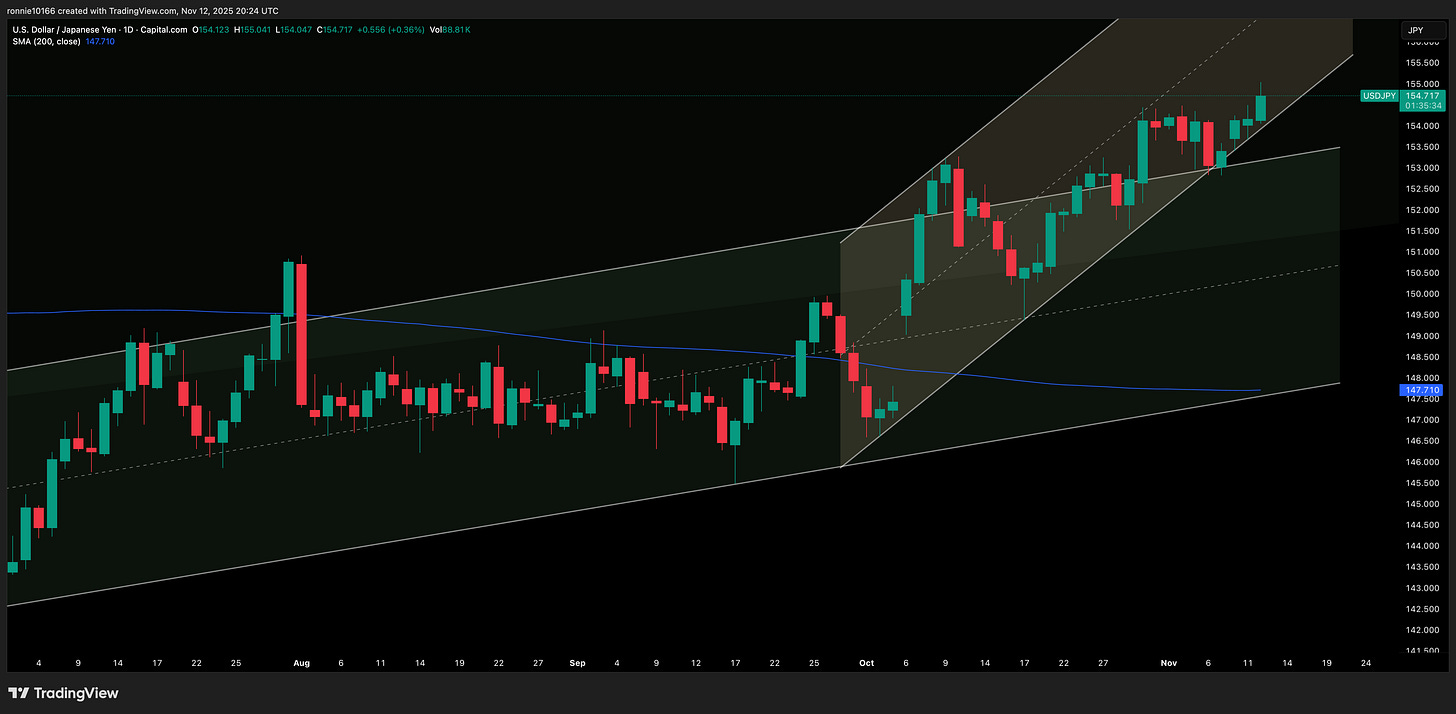 USD/YEN breaks over 154.50 even as DXY is falling shows that it’s a YEN problem. We’re looking to exit our trade at 160+ i.e. at the top of the trend channel.