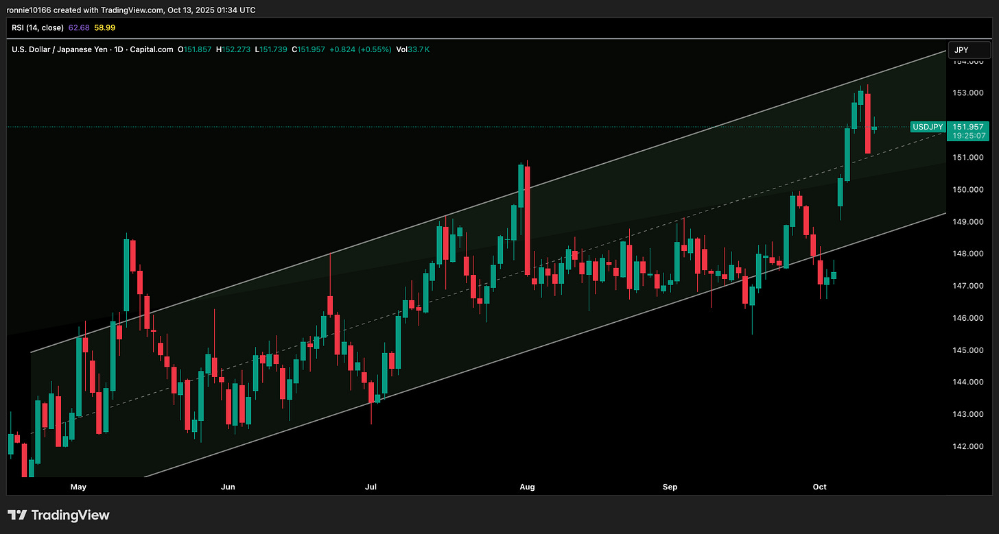 USD/YEN Update 13 October 2025Back to the midlineIan ReynoldsOct 13, 2025ShareTextbook pullback to the midline of the uptrend.We’d only be putting on more trades now when price trades back to support. Just let it run.PreviousNext