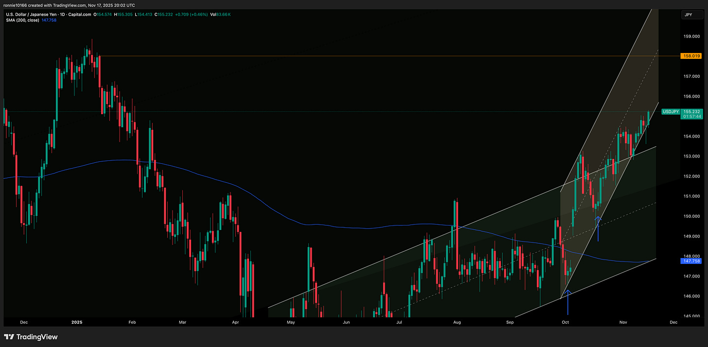 So we are looking for 160.00+ when price hits the top of the uptrend. We’ll have seen at least MoF, BoJ talk if not intervention. Stop (take profit) is now just below 152.80.