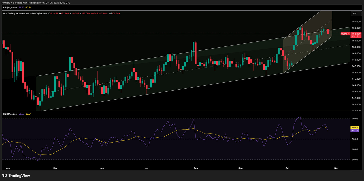 A big move down yesterday, along with USD in general, after 7 up days, was not a big surprise. The double top at 153.25 is now the key level to get price over. Trend support is at 151.40.