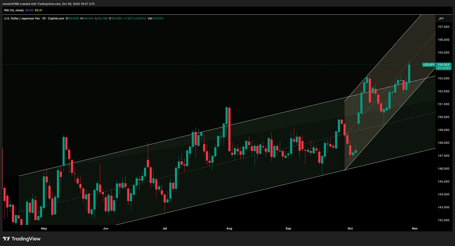 USD/YEN Update 31 October 2025SurgeIan ReynoldsOct 30, 2025∙ PaidShareThe break above 153.25 propelled price another big figure higher. DXY is higher too and nearly at a point of establishing a new higher trend for the USD. Not quite yet.This post is for paid subscribersSubscribeAlready a paid subscriber? Sign inPreviousNext