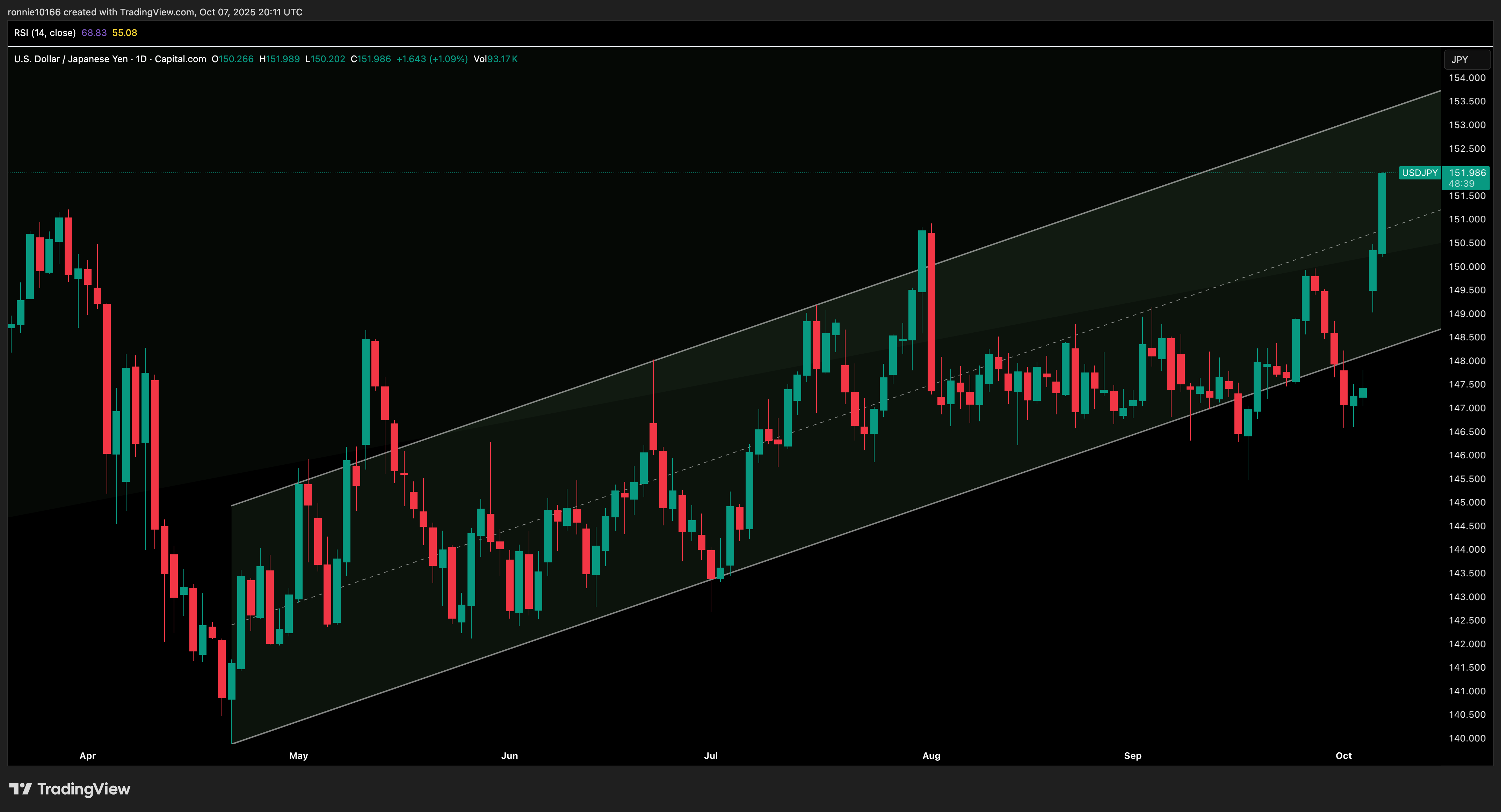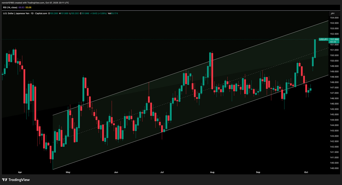 USD/YEN Update 8 October 2025RockershipIan ReynoldsOct 07, 2025∙ PaidShareLooks like we’re going to test resistance up at 153.25. A pullback to the midline of the trend at 151.00 would be nice buying level but for short-term traders only.This post is for paid subscribersSubscribeAlready a paid subscriber? Sign inPreviousNext