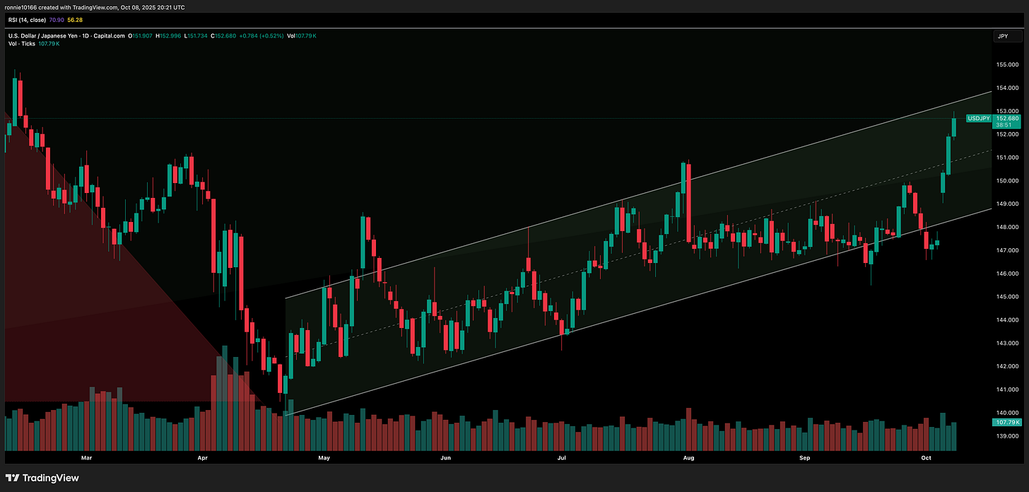 USD/YEN Update 9 October 2025Powering towards resistanceIan ReynoldsOct 09, 2025∙ PaidShareTrend resistance at 153.40 is not far away now. We’re up 6 big figures in 4 days. No pullbacks. In 6 more we’d be at the 158.90 pivot point or right shoulder on the daily chart.This post is for paid subscribersSubscribeAlready a paid subscriber? Sign inPreviousNext